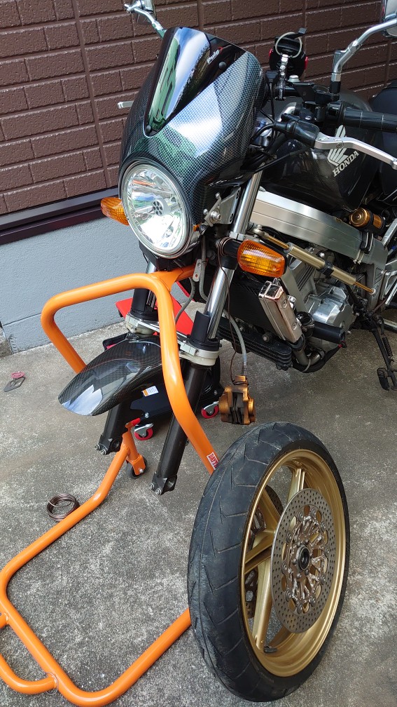 フロントはバイクに付いてるのを交換するので、デイトナのフロントスタンド掛けてとりあえず外す。