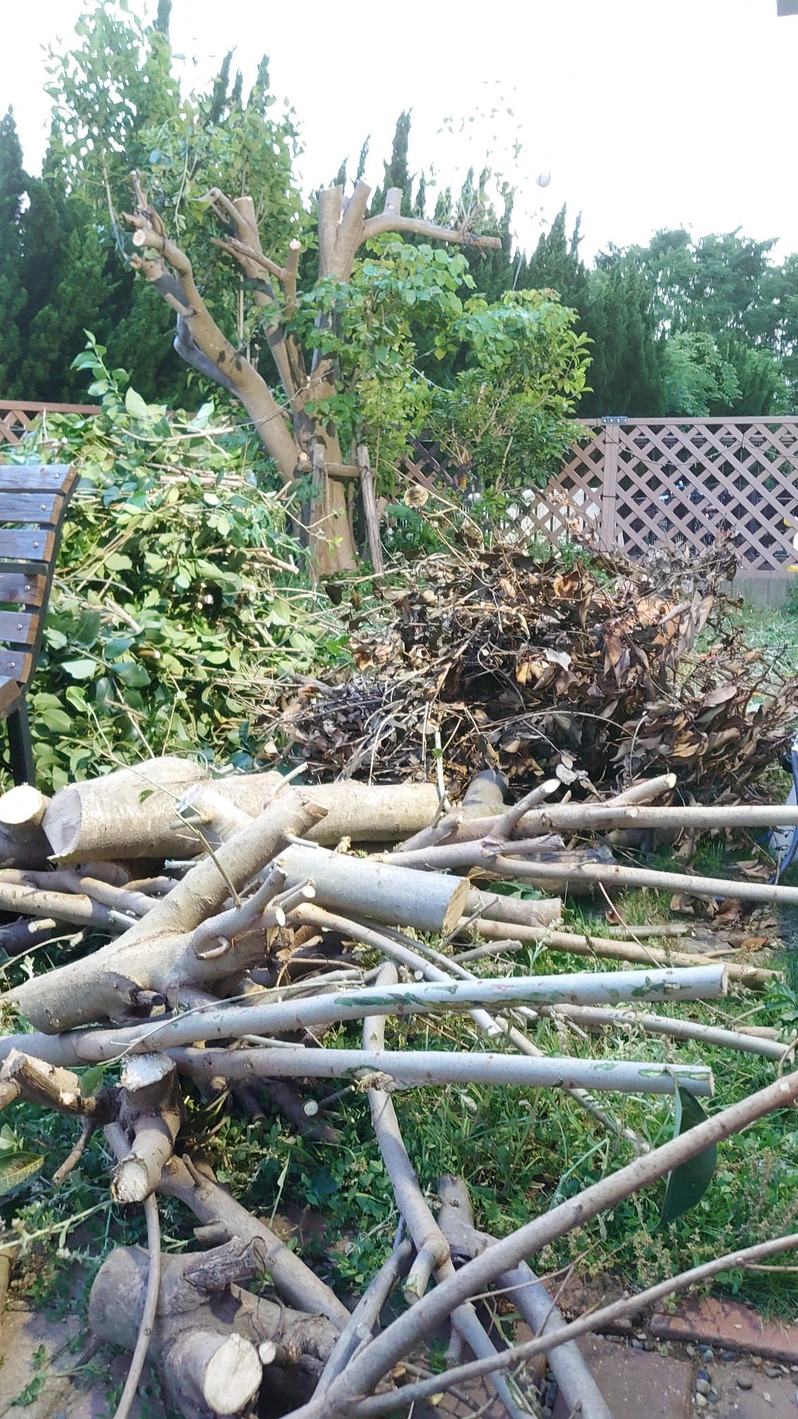 長男氏も帰ってこないので、一人作業だと枝の落下防止とか段取りを慎重にしないと手間が倍増する。